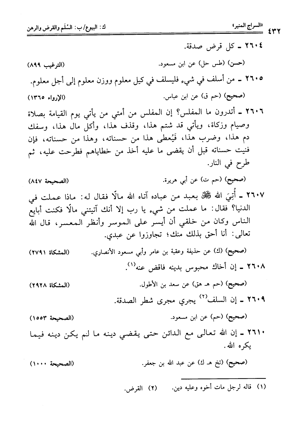 2609 - إن السلف (¬2) يجري مجرى شطر الصدقة.