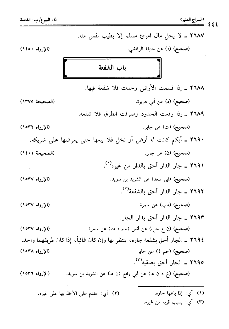2694 - الجار أحق بشفعة جاره، ينتظر بها وإن كان غائبًا، إذا كان طريقهما واحد.