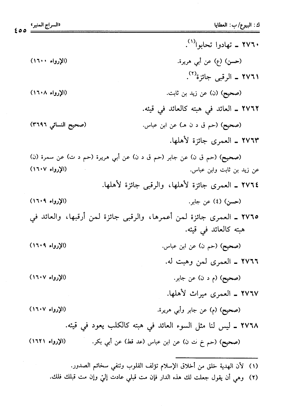 2765 - العمرى جائزة لمن أعمرها، والرقبى جائزة لمن أرقبها، والعائد في هبته كالعائد في قيئه.