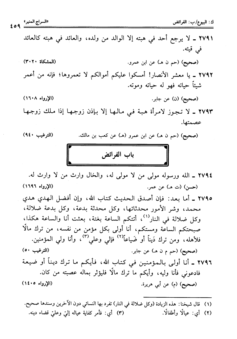(¬1) قال شيخنا: هذه الزيادة (وكل ضلالة في النار) تفرد بها النسائي دون الآخرين وسندها صحيح.
