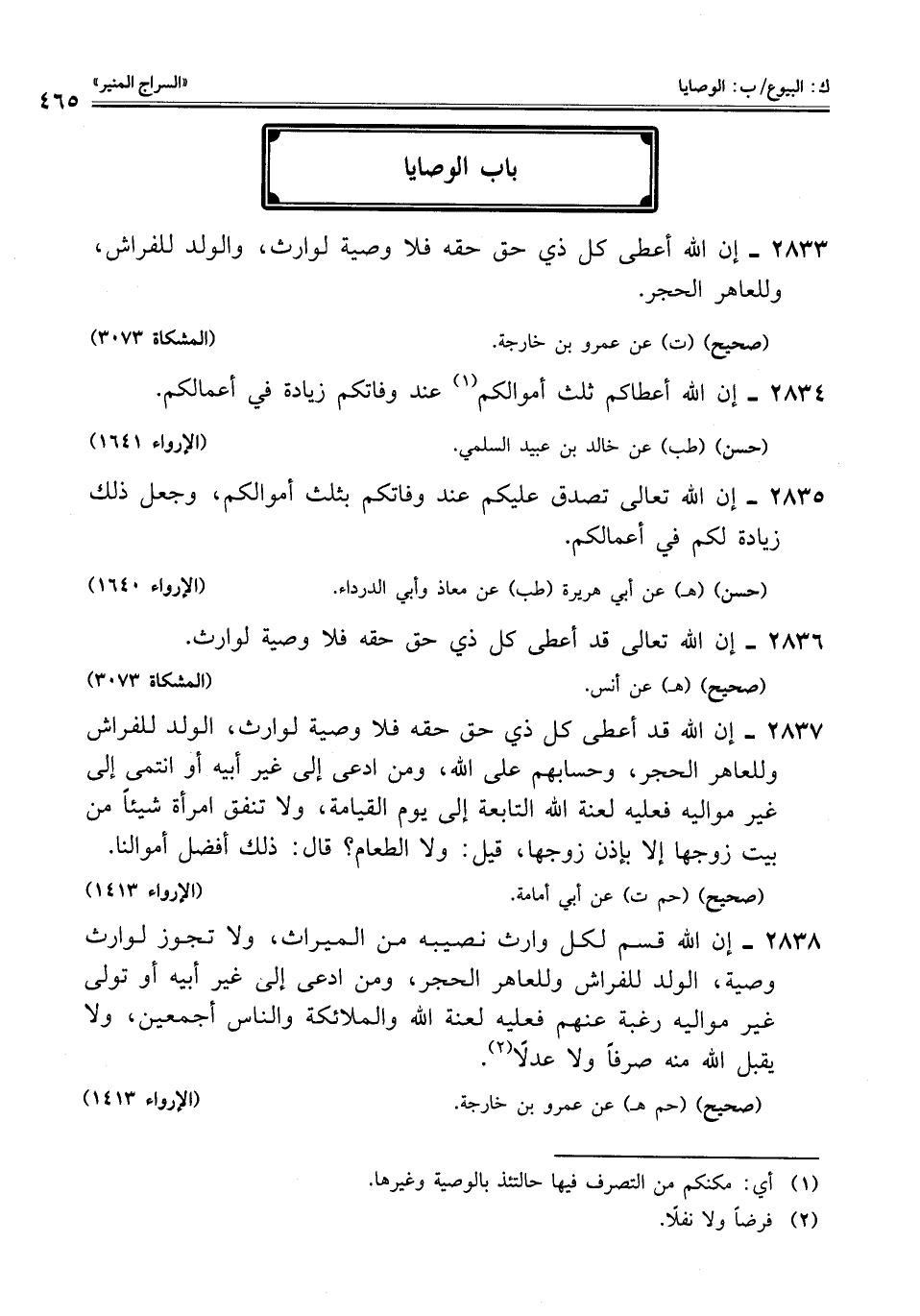 2838 - إن اللَّه قسم لكل وارث نصيبه من الميراث، ولا تجوز لوارث وصية، الولد للفراش وللعاهر الحجر، ومن ادعى إلى غير أبيه أو تولى غير مواليه رغبة عنهم فعليه لعنة اللَّه والملائكة والناس أجمعين، ولا يقبل اللَّه منه صرفًا ولا عدلًا (¬2).