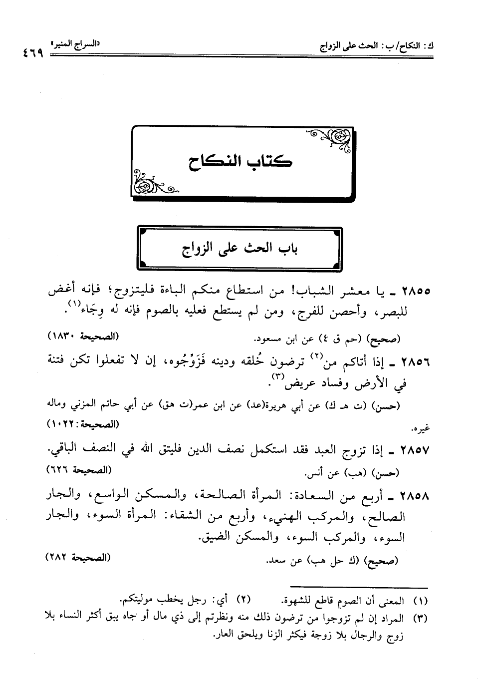 2855 - يا معشر الشباب! من استطاع منكم الباءة فليتزوج؛ فإنه أغض للبصر، وأحصن للفرج، ومن لم يستطع فعليه بالصوم فإنه له وِجَاء (¬1).
