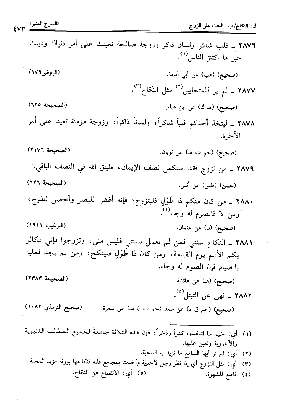 2881 - النكاح سنتي فمن لم يعمل بسنتي فليس مني، وتزوجوا فإني مكاثر بكم الأمم يوم القيامة، ومن كان ذا طَوْلٍ فلينكح، ومن لم يجد فعليه بالصيام فإن الصوم له وجاء.
