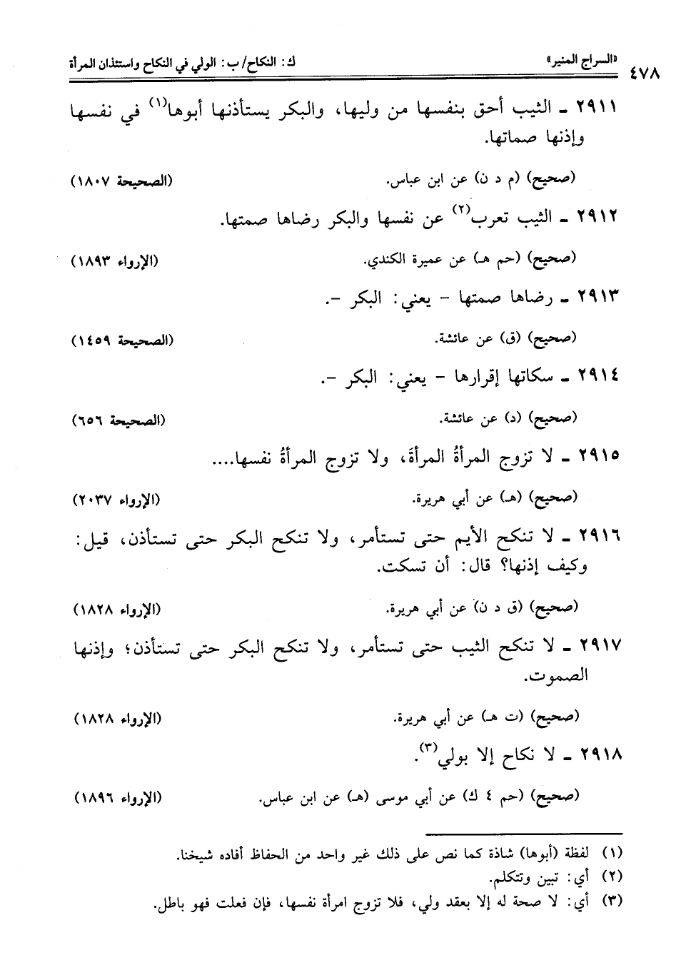 2916 - لا تنكح الأيم حتى تستأمر، ولا تنكح البكر حتى تستأذن، قيل: وكيف إذنها؟ قال: أن تسكت.