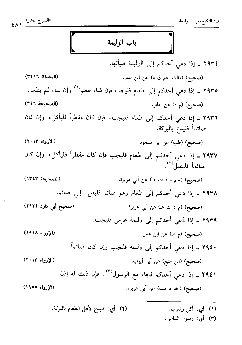 2937 - إذا دعي أحدكم إلى طعام فليجب فإن كان مفطرًا فليأكل، وإن كان صائمًا فليصل (¬2).