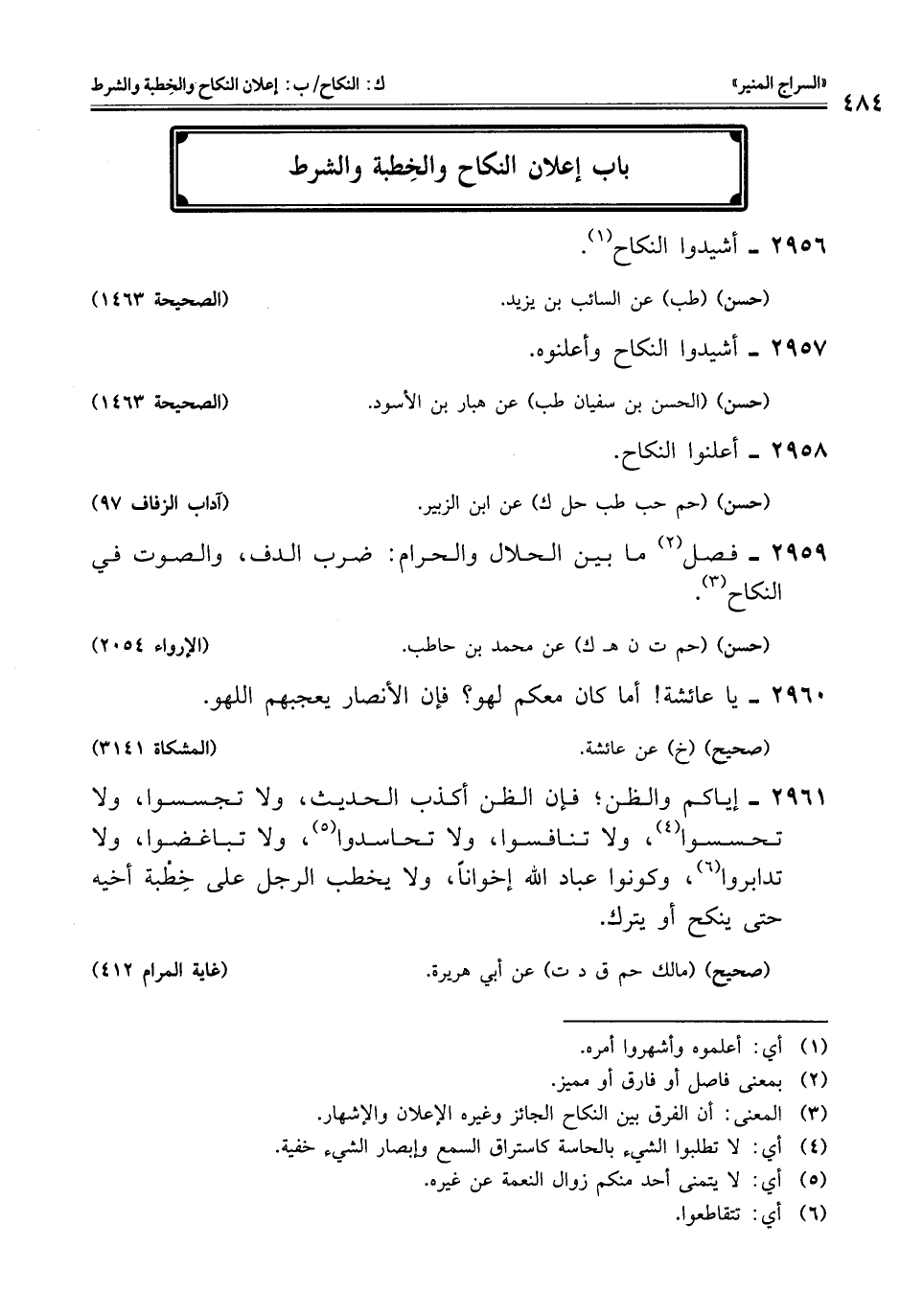 2961 - إياكم والظن؛ فإن الظن أكذب الحديث، ولا تجسسوا، ولا تحسسوا (¬4)، ولا تنافسوا، ولا تحاسدوا (¬5)، ولا تباغضوا، ولا تدابروا (¬6)، وكونوا عباد اللَّه إخوانًا، ولا يخطب الرجل على خِطْبة أخيه حتى ينكح أو يترك.