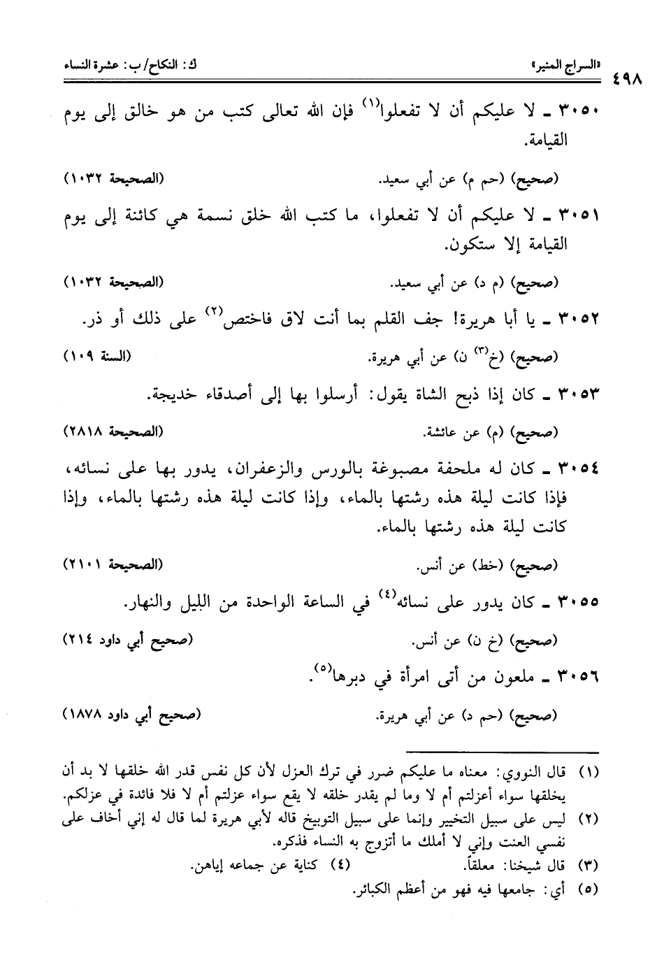 3054 - كان له ملحفة مصبوغة بالورس والزعفران، يدور بها على نسائه، فإذا كانت ليلة هذه رشتها بالماء، وإذا كانت ليلة هذه رشتها بالماء، وإذا كانت ليلة هذه رشتها بالماء.
