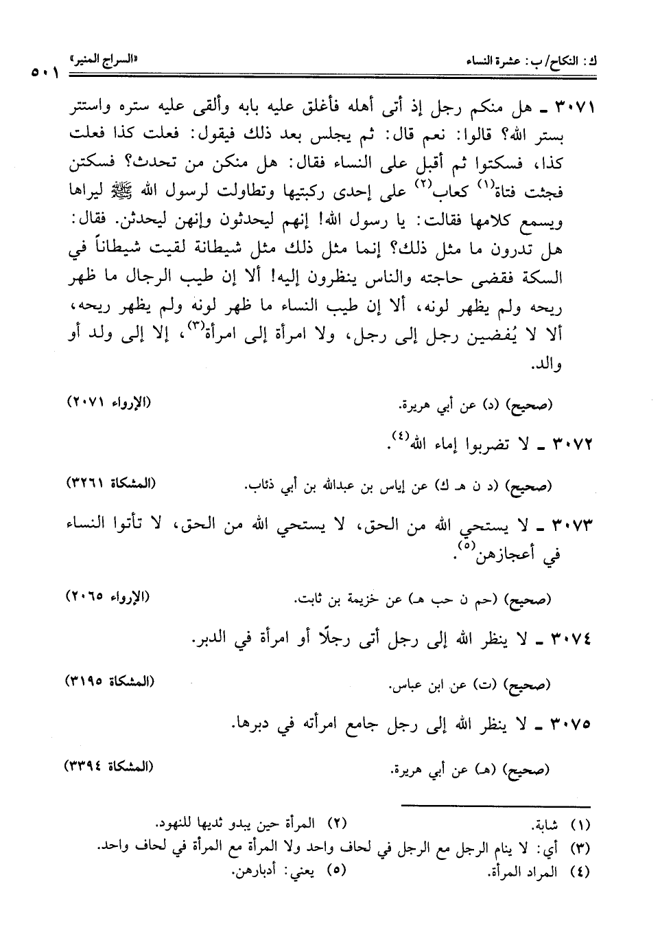 3073 - لا يستحي اللَّه من الحق، لا يستحي اللَّه من الحق، لا تأتوا النساء في أعجازهن (¬5).