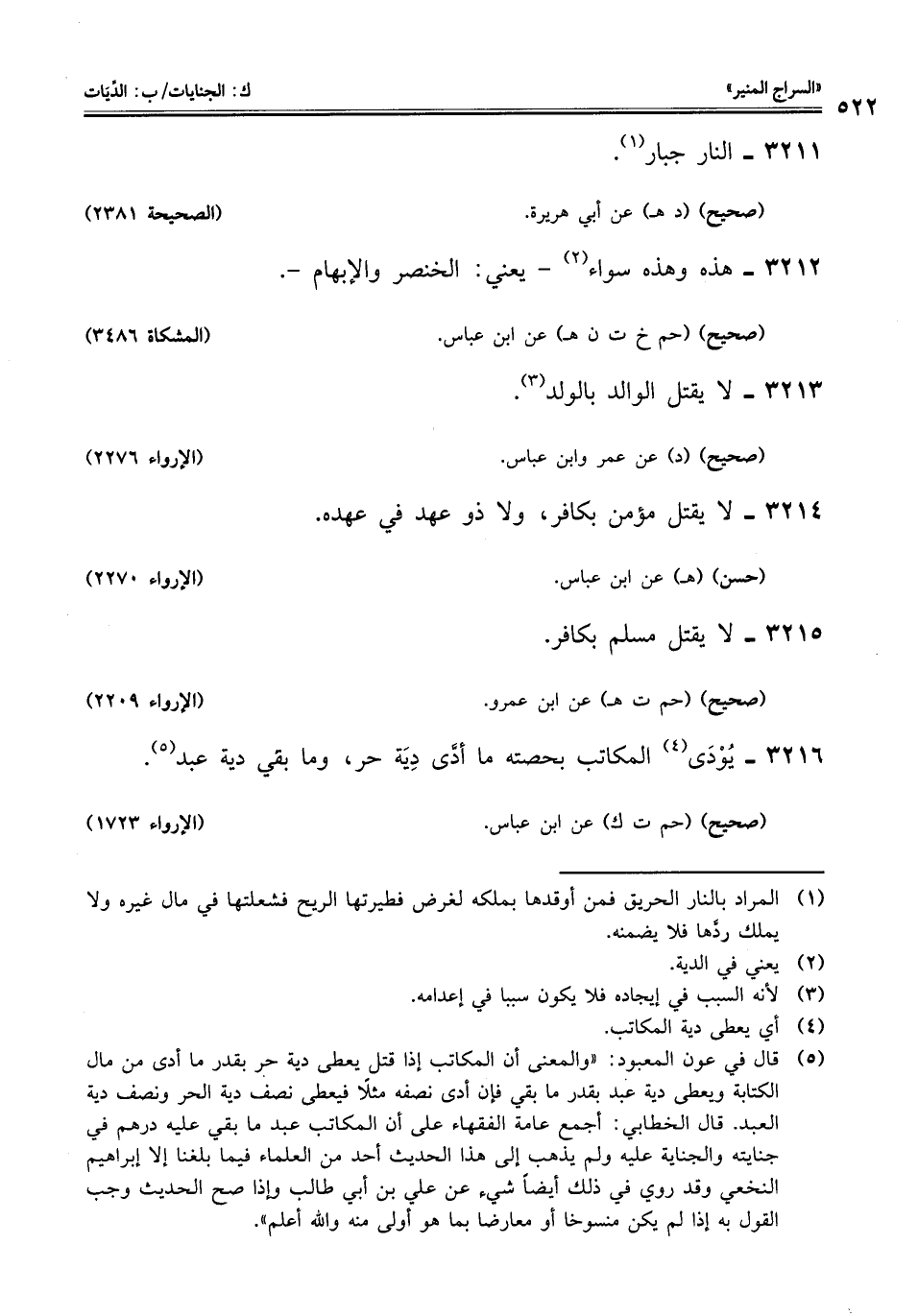 (¬5) قال في عون المعبود: "والمعنى أن المكاتب إذا قتل يعطى دية حر بقدر ما أدى من مال الكتابة ويعطى دية عبد بقدر ما بقي فإن أدى نصفه مثلًا فيعطى نصف دية الحر ونصف دية العبد. قال الخطابي: أجمع عامة الفقهاء على أن المكاتب عبد ما بقي عليه درهم في جنايته والجناية عليه ولم يذهب إلى هذا الحديث أحد من العلماء فيما بلغنا إلا إبراهيم النخعي وقد روي في ذلك أيضًا شيء عن علي بن أبي طالب وإذا صح الحديث وجب القول به إذا لم يكن منسوخًا أو معارضًا بما هو أولى منه واللَّه أعلم".