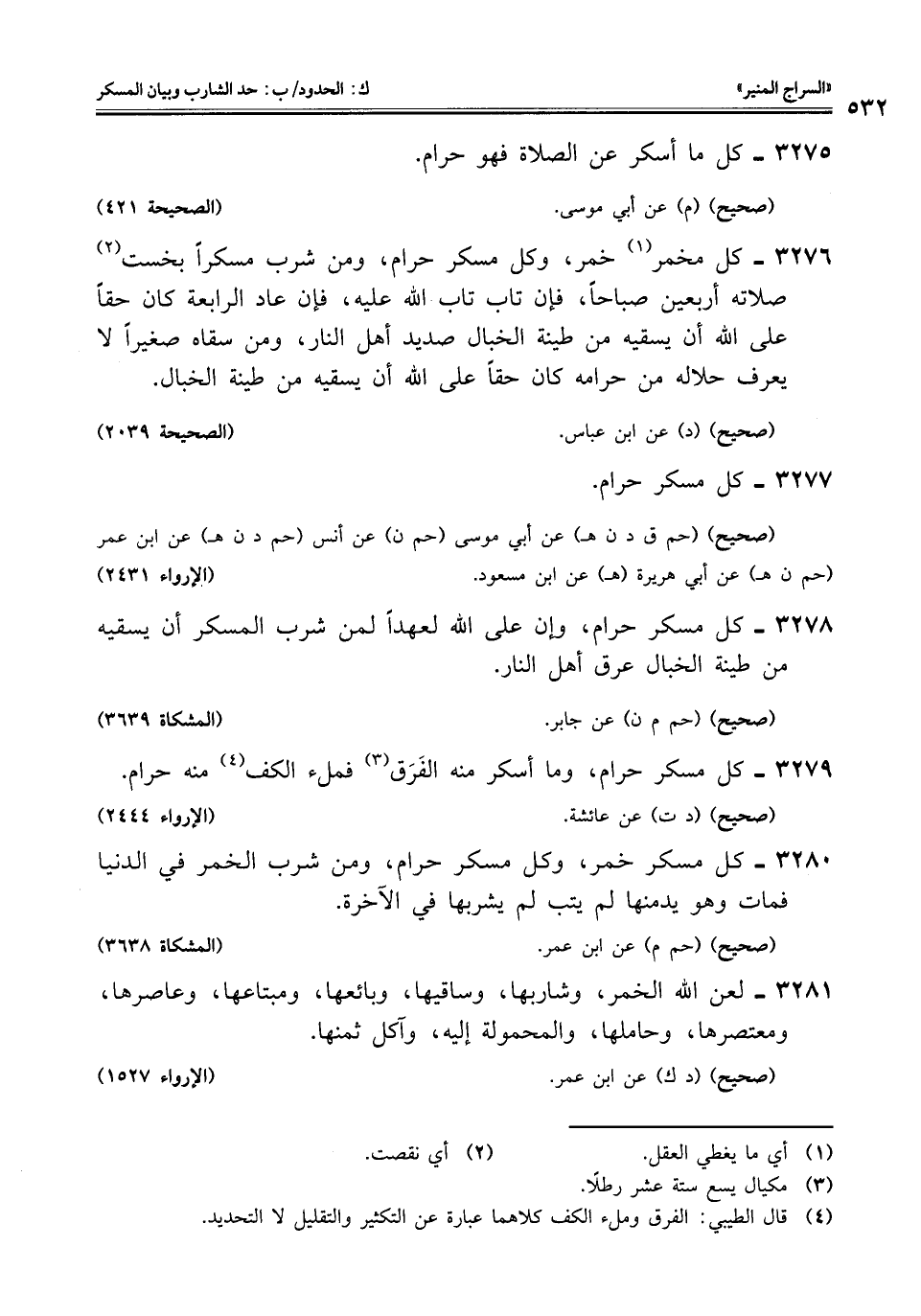 3279 - كل مسكر حرام، وما أسكر منه الفَرَق (¬3) فملء الكف (¬4) منه حرام.