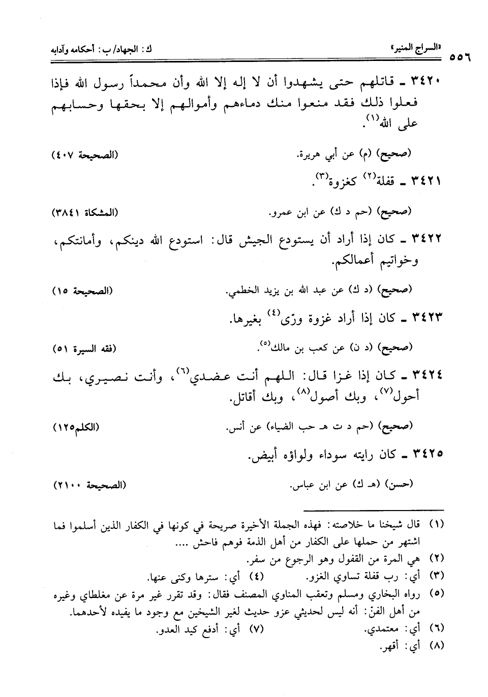 3420 - قاتلهم حتى يشهدوا أن لا إله إلا اللَّه وأن محمدًا رسول اللَّه فإذا فعلوا ذلك فقد منعوا منك دماءهم وأموالهم إلا بحقها وحسابهم على اللَّه (¬1).