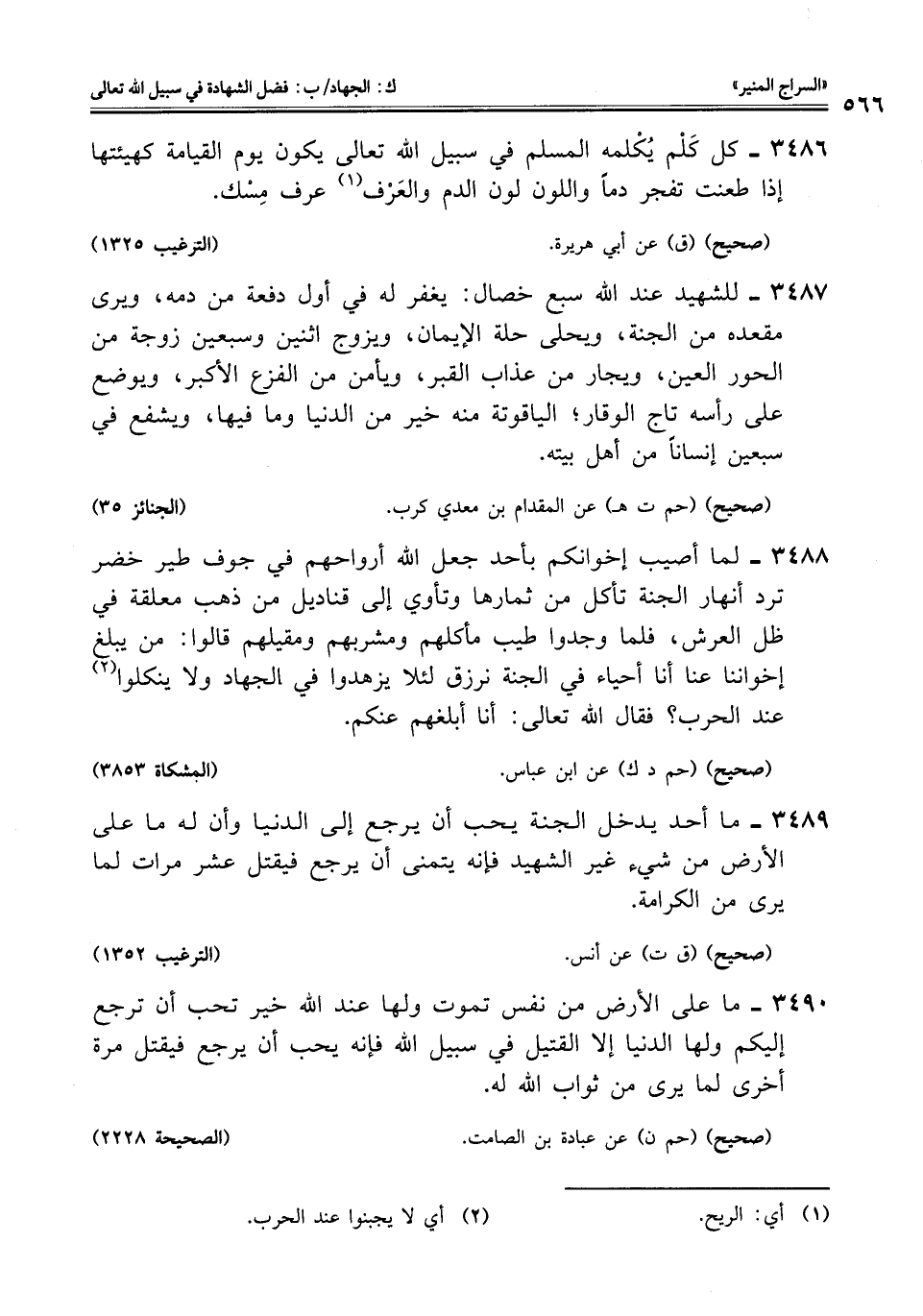 3486 - كل كَلْم يُكْلمه المسلم في سبيل اللَّه تعالى يكون يوم القيامة كهيئتها إذا طعنت تفجر دمًا واللون لون الدم والعَرْف (¬1) عرف مِسْك.