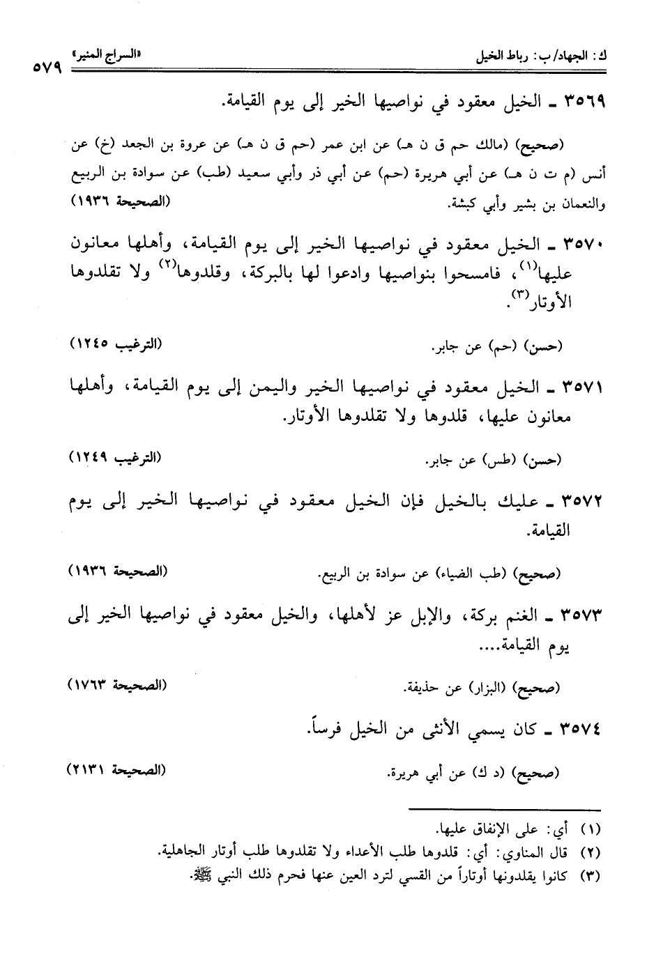 3571 - الخيل معقود في نواصيها الخير واليمن إلى يوم القيامة، وأهلها معانون عليها، قلدوها ولا تقلدوها الأوتار.