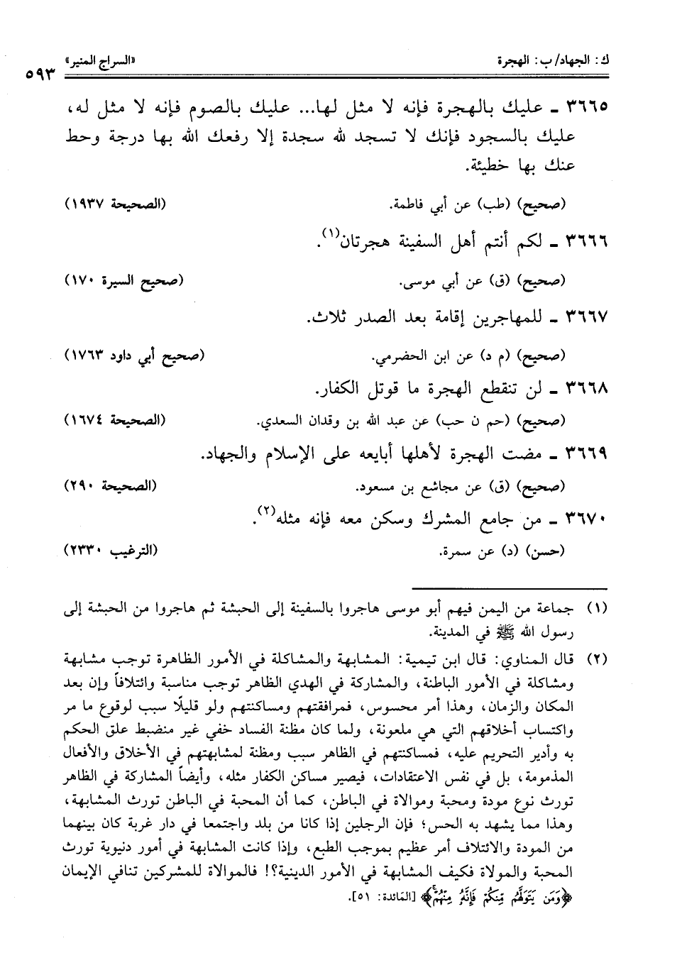 (¬2) قال المناوي: قال ابن تيمية: المشابهة والمشاكلة في الأمور الظاهرة توجب مشابهة ومشاكلة في الأمور الباطنة، والمشاركة في الهدي الظاهر توجب مناسبة وائتلافًا وإن بعد المكان والزمان، وهذا أمر محسوس، فمرافقتهم ومساكنتهم ولو قليلًا سبب لوقوع ما مر واكتساب أخلاقهم التي هي ملعونة، ولما كان مظنة الفساد خفي غير منضبط علق الحكم به وأدير التحريم عليه، فمساكنتهم في الظاهر سبب ومظنة لمشابهتهم في الأخلاق والأفعال المذمومة، بل في نفس الاعتقادات، فيصير مساكن الكفار مثله، وأيضًا المشاركة في الظاهر تورث نوع مودة ومحبة وموالاة في الباطن، كما أن المحبة في الباطن تورث المشابهة، وهذا مما يشهد به الحس؛ فإن الرجلين إذا كانا من بلد واجتمعا في دار غربة كان بينهما من المودة والائتلاف أمر عظيم بموجب الطبع، وإذا كانت المشابهة في أمور دنيوية تورث المحبة والمولاة فكيف المشابهة في الأمور الدينية؟! فالموالاة للمشركين تنافي الإيمان {وَمَنْ يَتَوَلَّهُمْ مِنْكُمْ فَإِنَّهُ مِنْهُمْ} [المائدة: 51].