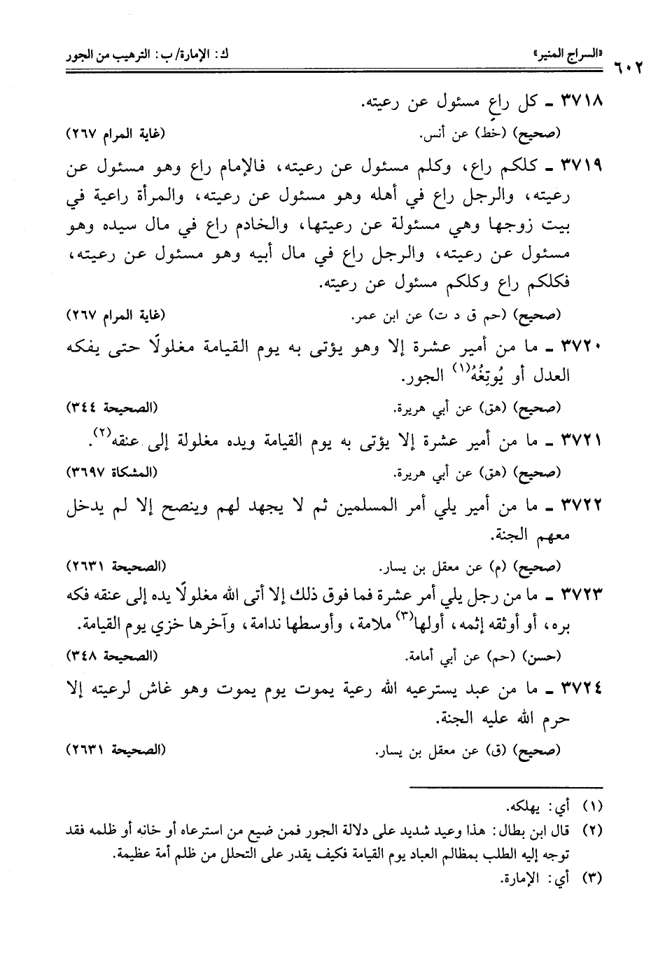 (¬2) قال ابن بطال: هذا وعيد شديد على دلالة الجور فمن ضيع من استرعاه أو خانه أو ظلمه فقد توجه إليه الطلب بمظالم العباد يوم القيامة فكيف يقدر على التحلل من ظلم أمة عظيمة.