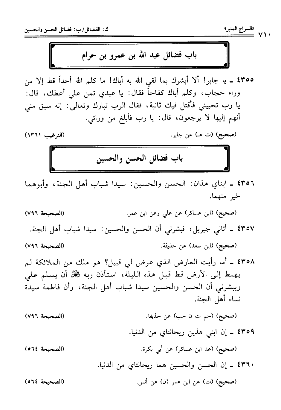 4358 - أما رأيت العارض الذي عرض لي قبيل؟ هو ملك من الملائكة لم يهبط إلى الأرض قط قبل هذه الليلة، استأذن ربه عز وجل أن يسلم علي ويبشرني أن الحسن والحسين سيدا شباب أهل الجنة، وأن فاطمة سيدة نساء أهل الجنة.