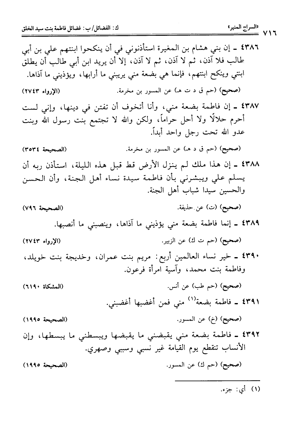 4386 - إن بني هشام بن المغيرة استأذنوني في أن ينكحوا ابنتهم علي بن أبي طالب فلا آذن، ثم لا آذن، ثم لا آذن، إلا أن يريد ابن أبي طالب أن يطلق ابنتي وينكح ابنتهم، فإنما هي بضعة مني يريبني ما أرابها، ويؤذيني ما آذاها.