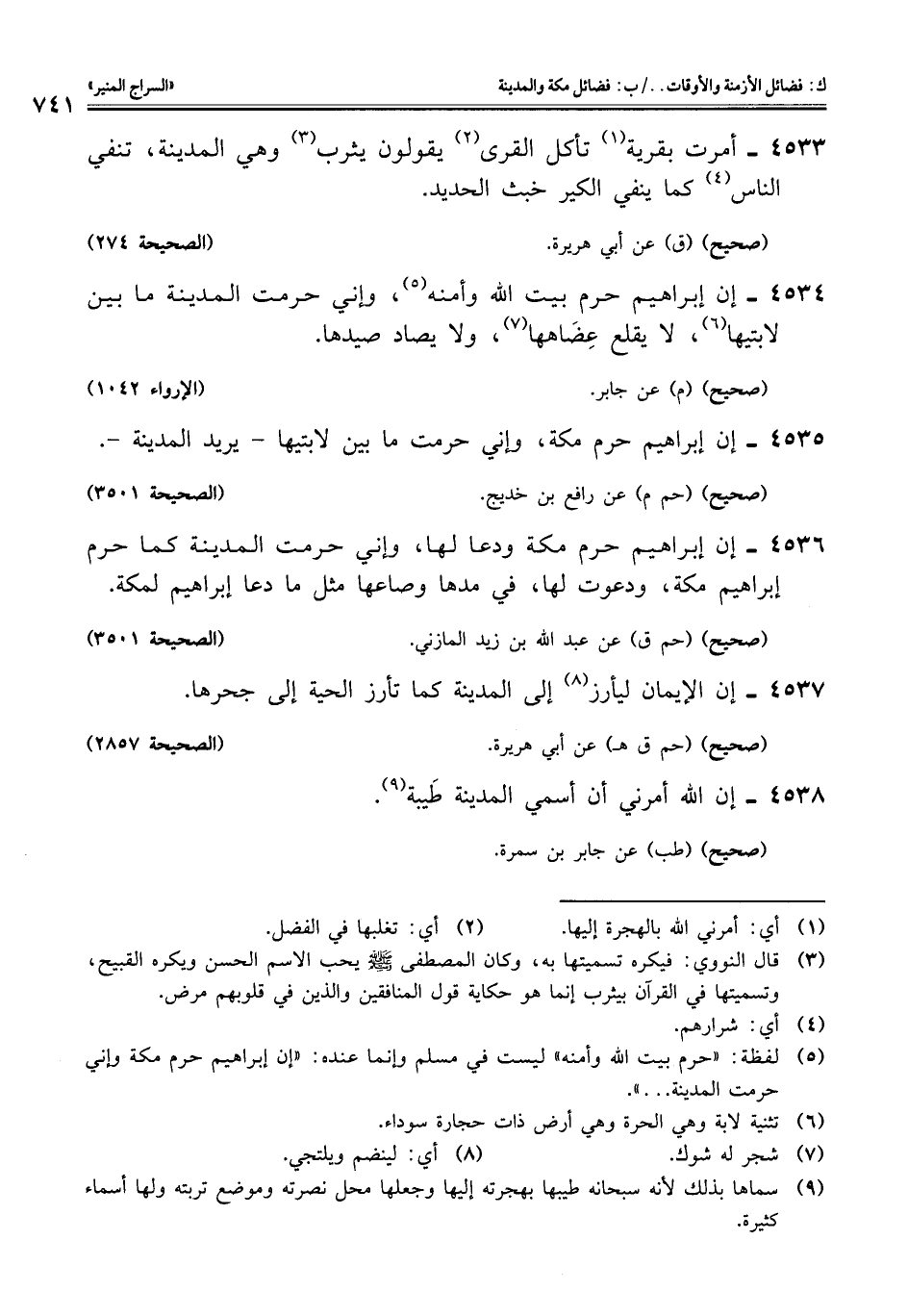 (¬3) قال النووي: فيكره تسميتها به، وكان المصطفى -صلى اللَّه عليه وسلم- يحب الاسم الحسن ويكره القبيح، وتسميتها في القرآن بيثرب إنما هو حكاية قول المنافقين والذين في قلوبهم مرض.