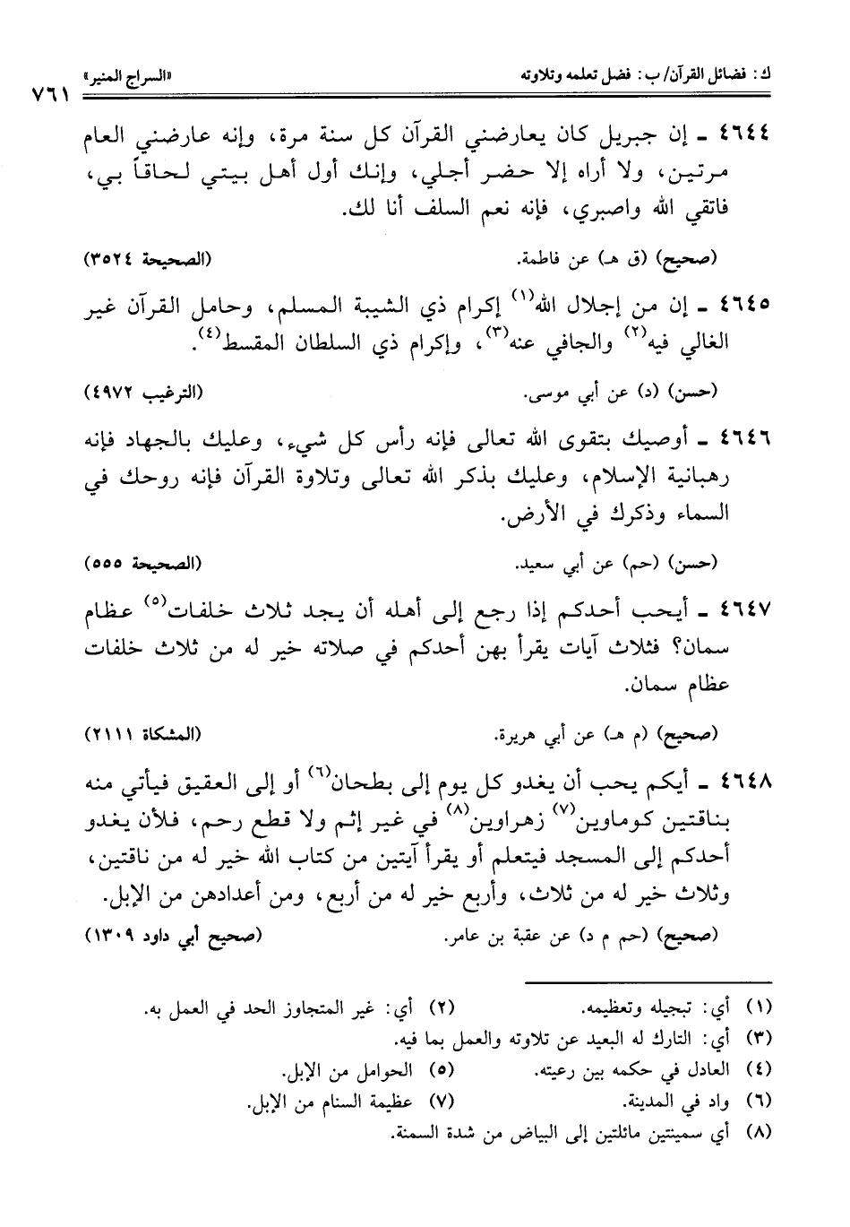 4647 - أيحب أحدكم إذا رجع إلى أهله أن يجد ثلاث خلفات (¬5) عظام سمان؟ فثلاث آيات يقرأ بهن أحدكم في صلاته خير له من ثلاث خلفات عظام سمان.