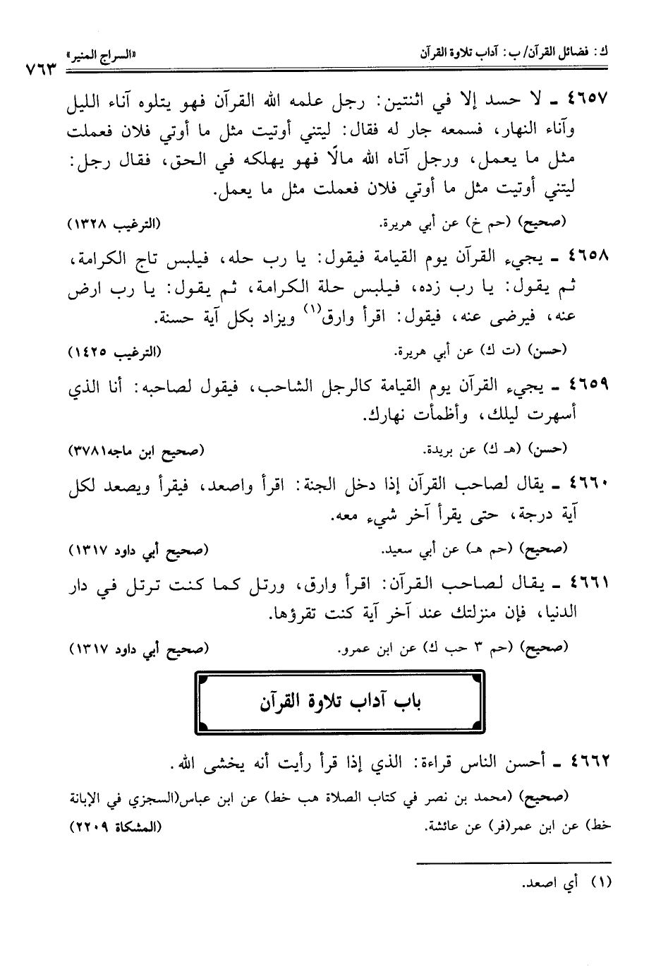 4661 - يقال لصاحب القرآن: اقرأ وارق، ورتل كما كنت ترتل في دار الدنيا، فإن منزلتك عند آخر آية كنت تقرؤها.