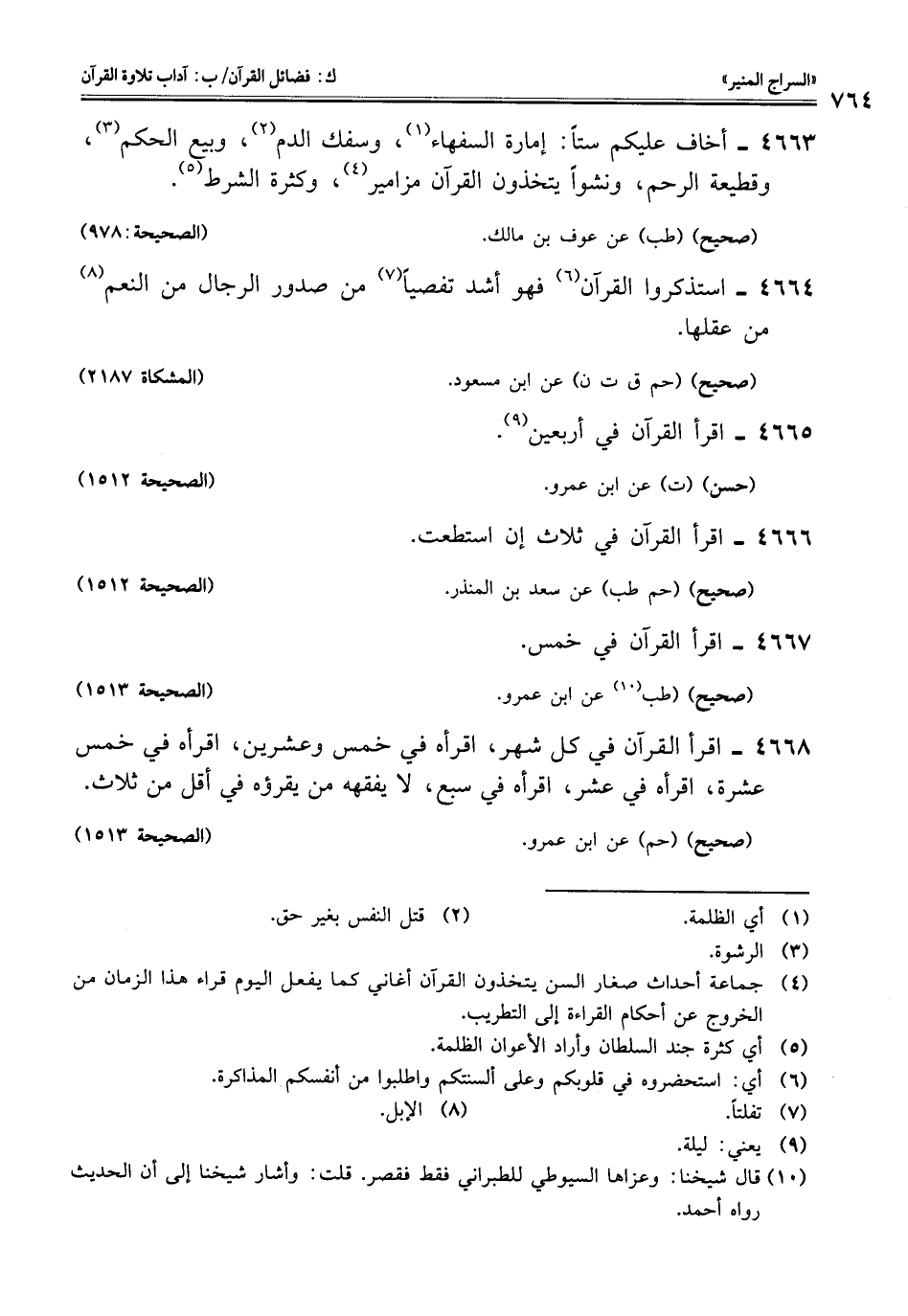 4668 - اقرأ القرآن في كل شهر، اقرأه في خمس وعشرين، اقرأه في خمس عشرة، اقرأه في عشر، اقرأه في سبع، لا يفقهه من يقرؤه في أقل من ثلاث.