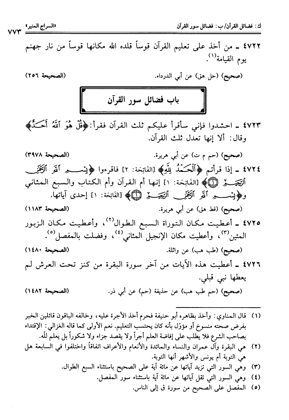 4725 - أعطيت مكان التوراة السبع الطوال (¬2)، وأعطيت مكان الزبور المئين (¬3)، وأعطيت مكان الإنجيل المثاني (¬4)، وفضلت بالمفصل (¬5).