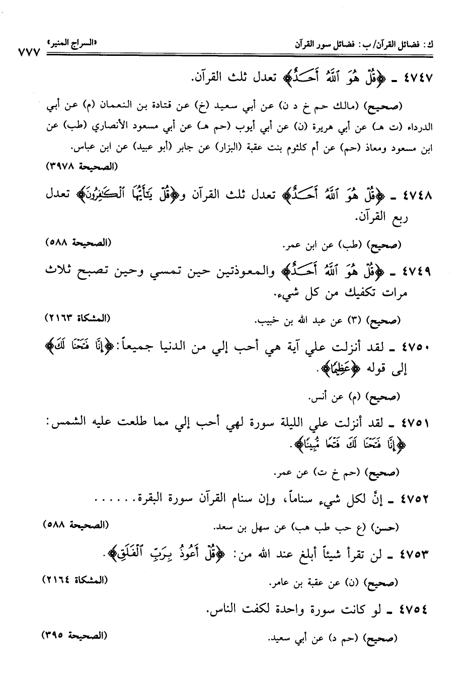 4748 - {قُلْ هُوَ اللَّهُ أَحَدٌ} تعدل ثلث القرآن و {قُلْ يَاأَيُّهَا الْكَافِرُونَ} تعدل ربع القرآن.
