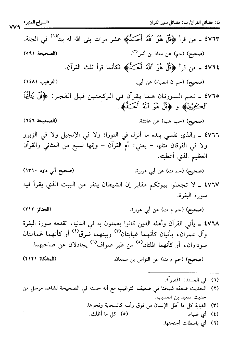 4763 - من قرأ {قُلْ هُوَ اللَّهُ أَحَدٌ} عشر مرات بنى اللَّه له بيتًا (¬1) في الجنة.