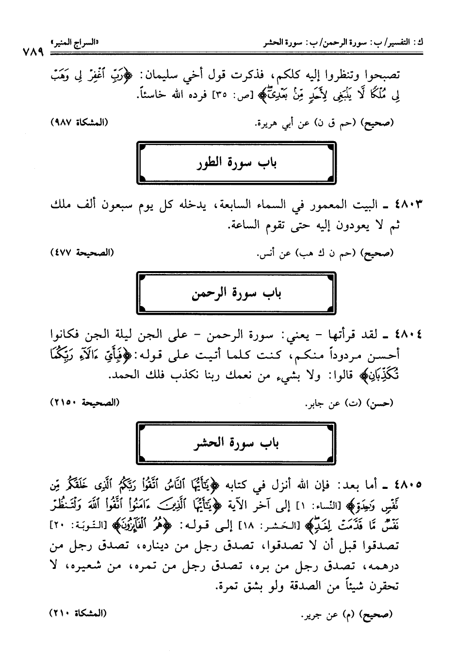 4804 - لقد قرأتها -يعني: سورة الرحمن- على الجن ليلة الجن فكانوا أحسن مردودًا منكم، كنت كلما أتيت على قوله: {فَبِأَيِّ آلَاءِ رَبِّكُمَا تُكَذِّبَانِ} قالوا: ولا بشيء من نعمك ربنا نكذب فلك الحمد.