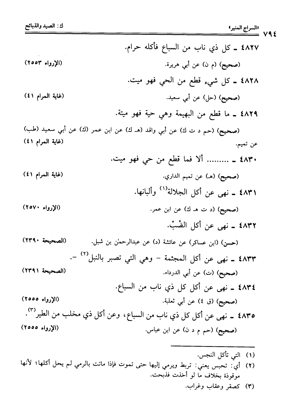 4835 - نهى عن أكل كل ذي ناب من السباع، وعن أكل ذي مخلب من الطير (¬3).