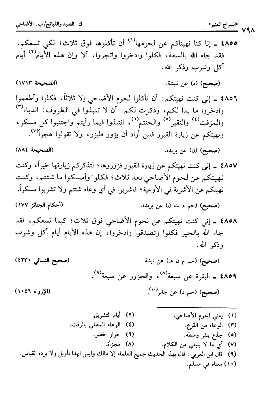 4856 - إني كنت نهيتكم: أن تأكلوا لحوم الأضاحي إلا ثلاثًا، فكلوا وأطعموا وادخروا ما بدا لكم، وذكرت لكم: أن لا تنبذوا في الظروف: الدباء (¬3) والمزفت (¬4) والنقير (¬5) والحنتم (¬6)، انتبذوا فيما رأيتم واجتنبوا كل مسكر، ونهيتكم عن زيارة القبور فمن أراد أن يزور فليزر، ولا تقولوا هجرًا (¬7).