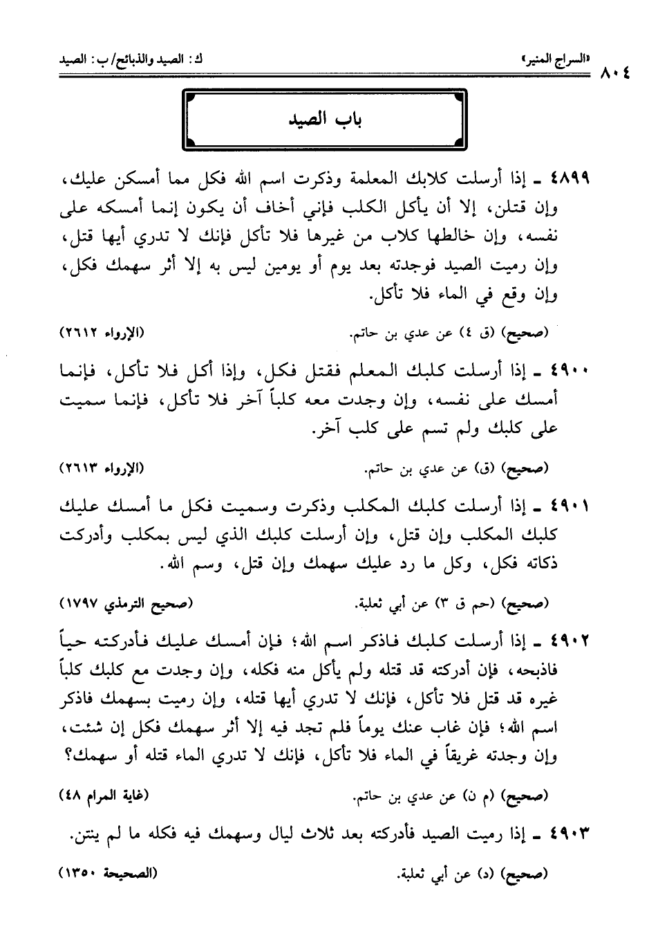 4903 - إذا رميت الصيد فأدركته بعد ثلاث ليال وسهمك فيه فكله ما لم ينتن.