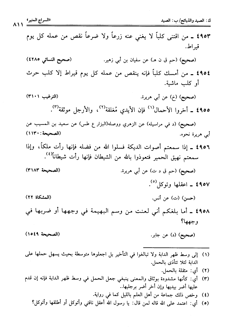 4954 - من أمسك كلبًا فإنه ينقص من عمله كل يوم قيراط إلا كلب حرث أو كلب ماشية.