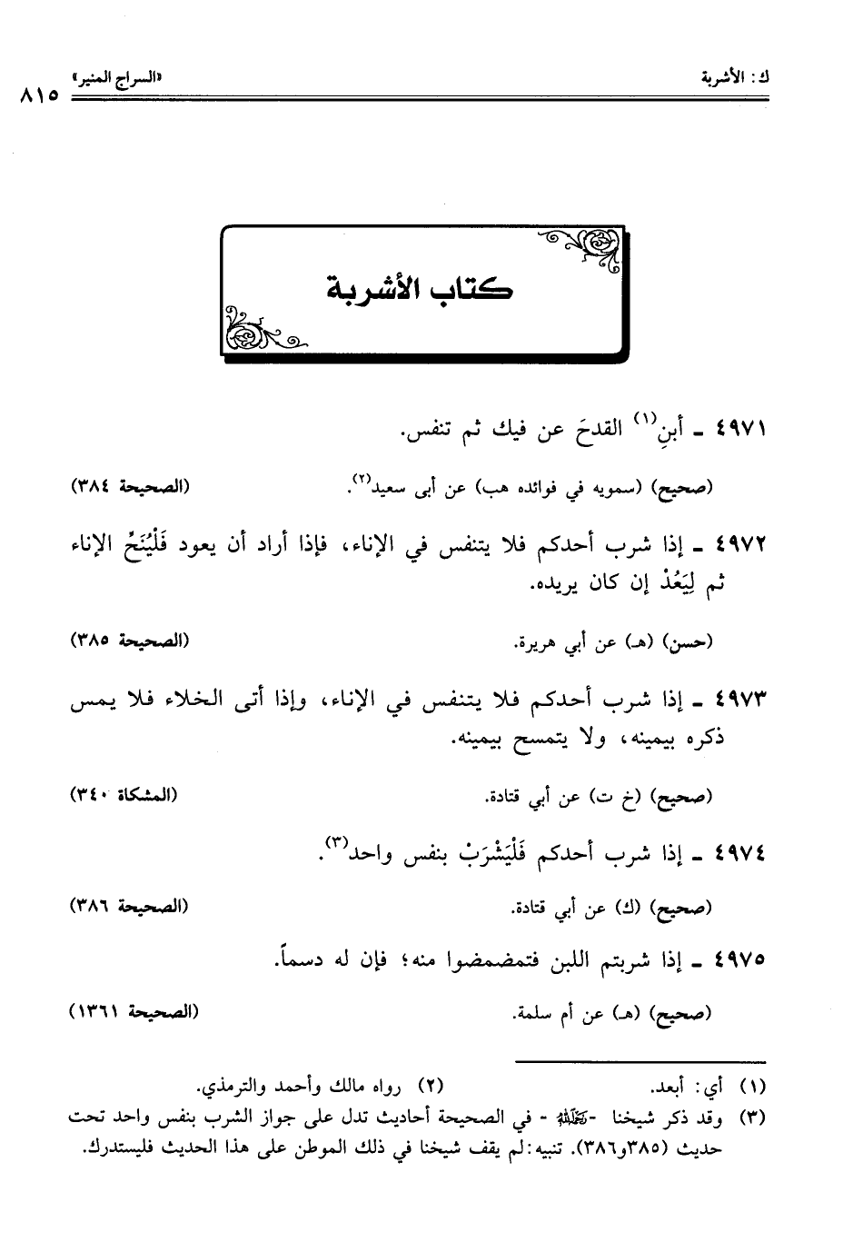 4974 - إذا شرب أحدكم فَلْيَشْرَبْ بنفس واحد (¬3).
