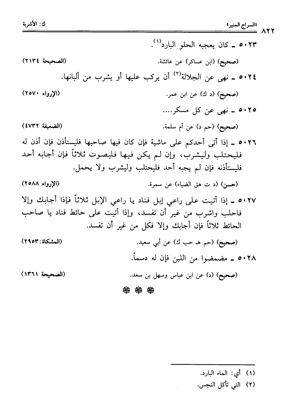5027 - إذا أتيت على راعي إبل فناد يا راعي الإبل ثلاثًا فإذا أجابك وإلا فاحلب واشرب من غير أن تفسد، وإذا أتيت على حائط فناد يا صاحب الحائط ثلاثًا فإن أجابك وإلا فكل من غير أن تفسد.