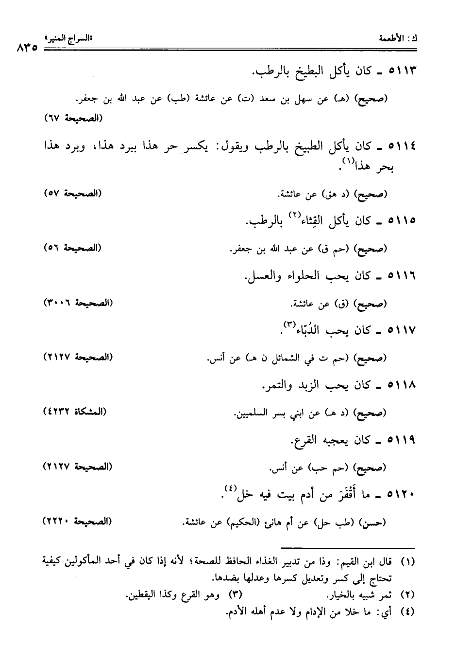 5114 - كان يأكل الطبيخ بالرطب ويقول: يكسر حر هذا ببرد هذا، وبرد هذا بحر هذا (¬1).