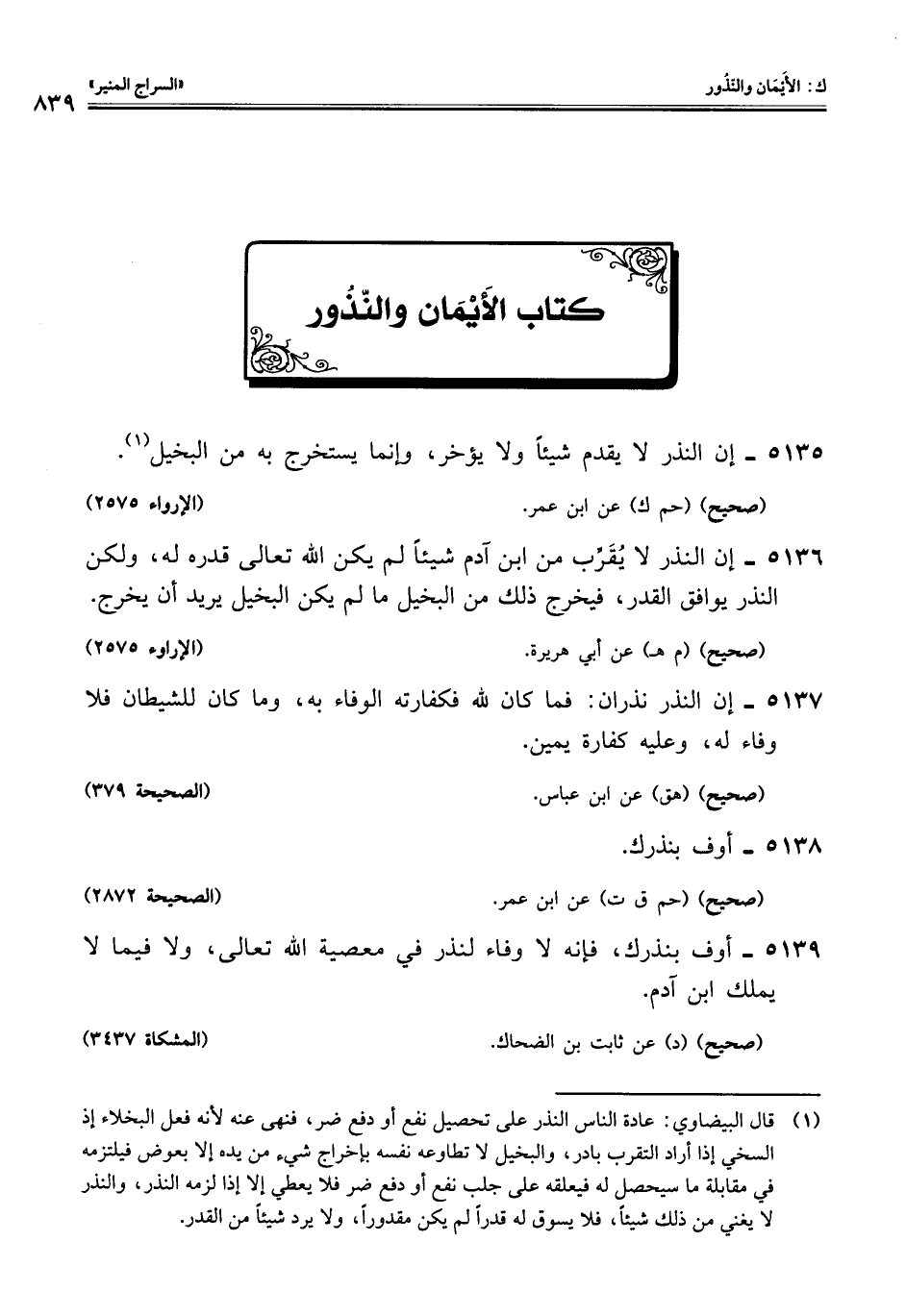 5135 - إن النذر لا يقدم شيئًا ولا يؤخر، وإنما يستخرج به من البخيل (¬1).