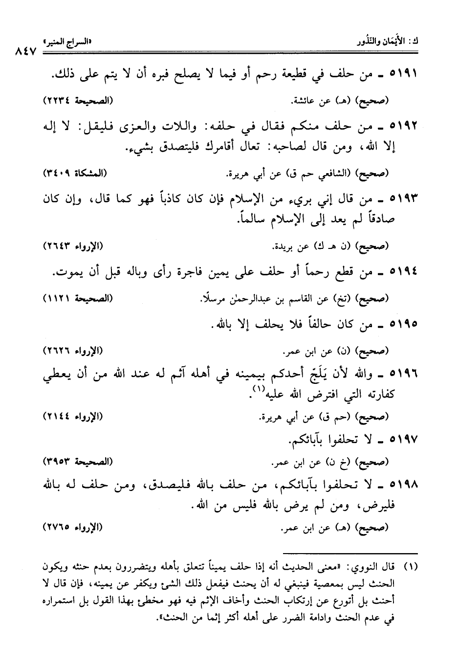 5191 - من حلف في قطيعة رحم أو فيما لا يصلح فبره أن لا يتم على ذلك.