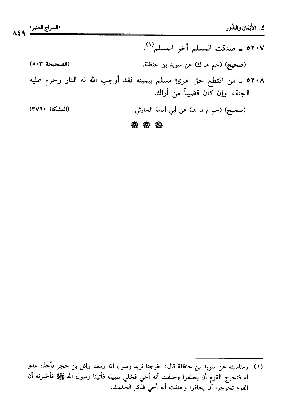 5208 - من اقتطع حق امرئ مسلم بيمينه فقد أوجب اللَّه له النار وحرم عليه الجنة، وإن كان قضيبًا من أراك.