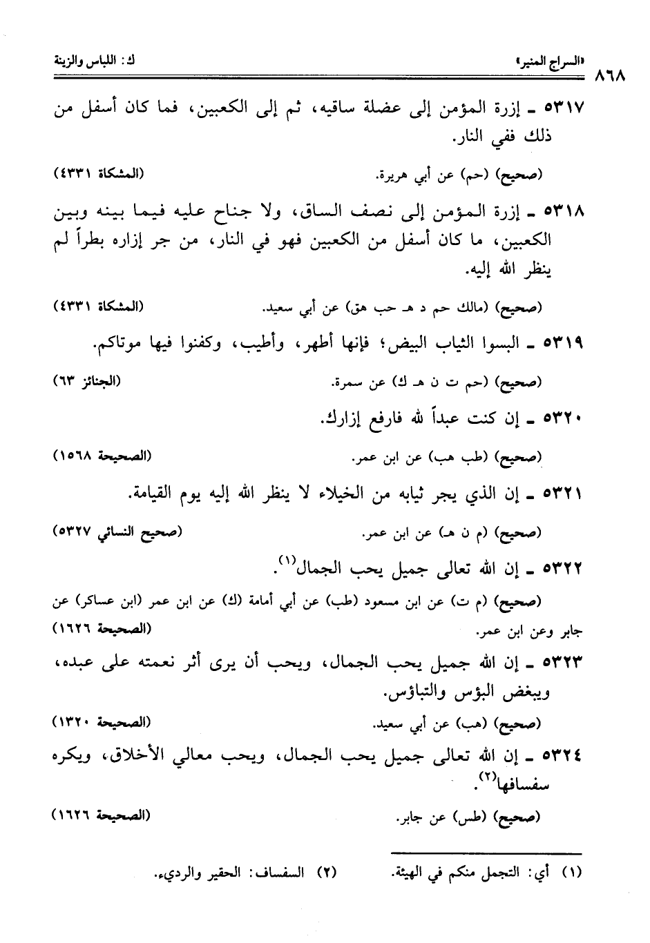 5317 - إزرة المؤمن إلى عضلة ساقيه، ثم إلى الكعبين، فما كان أسفل من ذلك ففي النار.