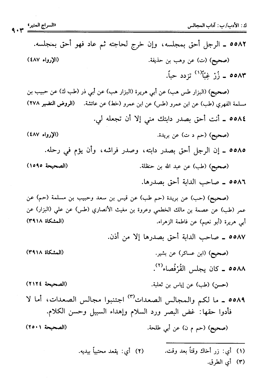 5585 - إن الرجل أحق بصدر دابته، وصدر فراشه، وأن يؤم في رحله.