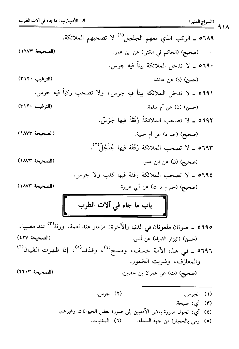 5693 - لا تصحب الملائكة رُفْقَة فيها جُلْجُلٌ (¬2).