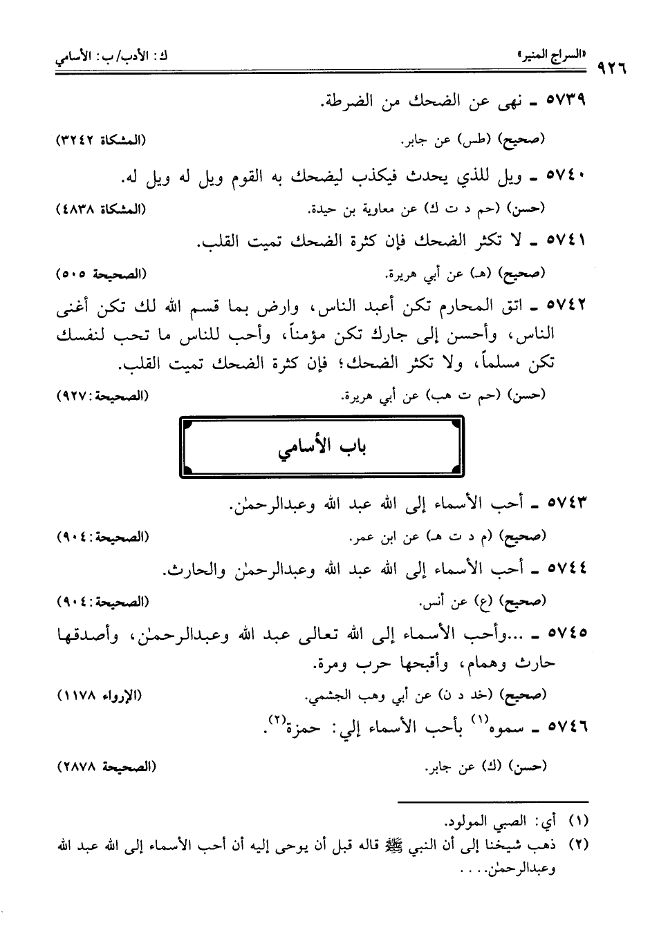 (¬2) ذهب شيخنا إلى أن النبي -صلى اللَّه عليه وسلم- قاله قبل أن يوحى إليه أن أحب الأسماء إلى اللَّه عبد اللَّه وعبد الرحمن. . . .