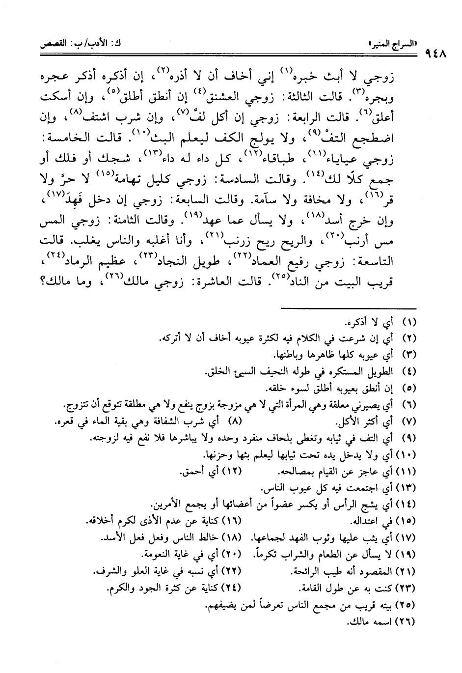 زوجي لا أبث خبره (¬1) إني أخاف أن لا أذره (¬2)، إن أذكره أذكر عجره وبجره (¬3). قالت الثالثة: زوجي العشنق (¬4) إن أنطق أطلق (¬5)، وإن أسكت أعلق (¬6). قالت الرابعة: زوجي إن أكل لفَّ (¬7)، وإن شرب اشتف (¬8)، وإن اضطجع التفَّ (¬9)، ولا يولج الكف ليعلم البث (¬10). قالت الخامسة: زوجي عياياء (¬11)، طباقاء (¬12)، كل داء له داء (¬13)، شجك أو فلك أو جمع كلًا لك (¬14). وقالت السادسة: زوجي كليل تهامة (¬15) لا حرَّ ولا قر (¬16)، ولا مخافة ولا سآمة. وقالت السابعة: زوجي إن دخل فَهِدَ (¬17)، وإن خرج أسد (¬18)، ولا يسأل عما عهد (¬19). وقالت الثامنة: زوجي المس مس أرنب (¬20)، والربح ريح زرنب (¬21)، وأنا أغلبه والناس يغلب. قالت التاسعة: زوجي رفيع العماد (¬22)، طويل النجاد (¬23)، عظيم الرماد (¬24)، قريب البيت من الناد (¬25). قالت العاشرة: زوجي مالك (¬26)، وما مالك؟