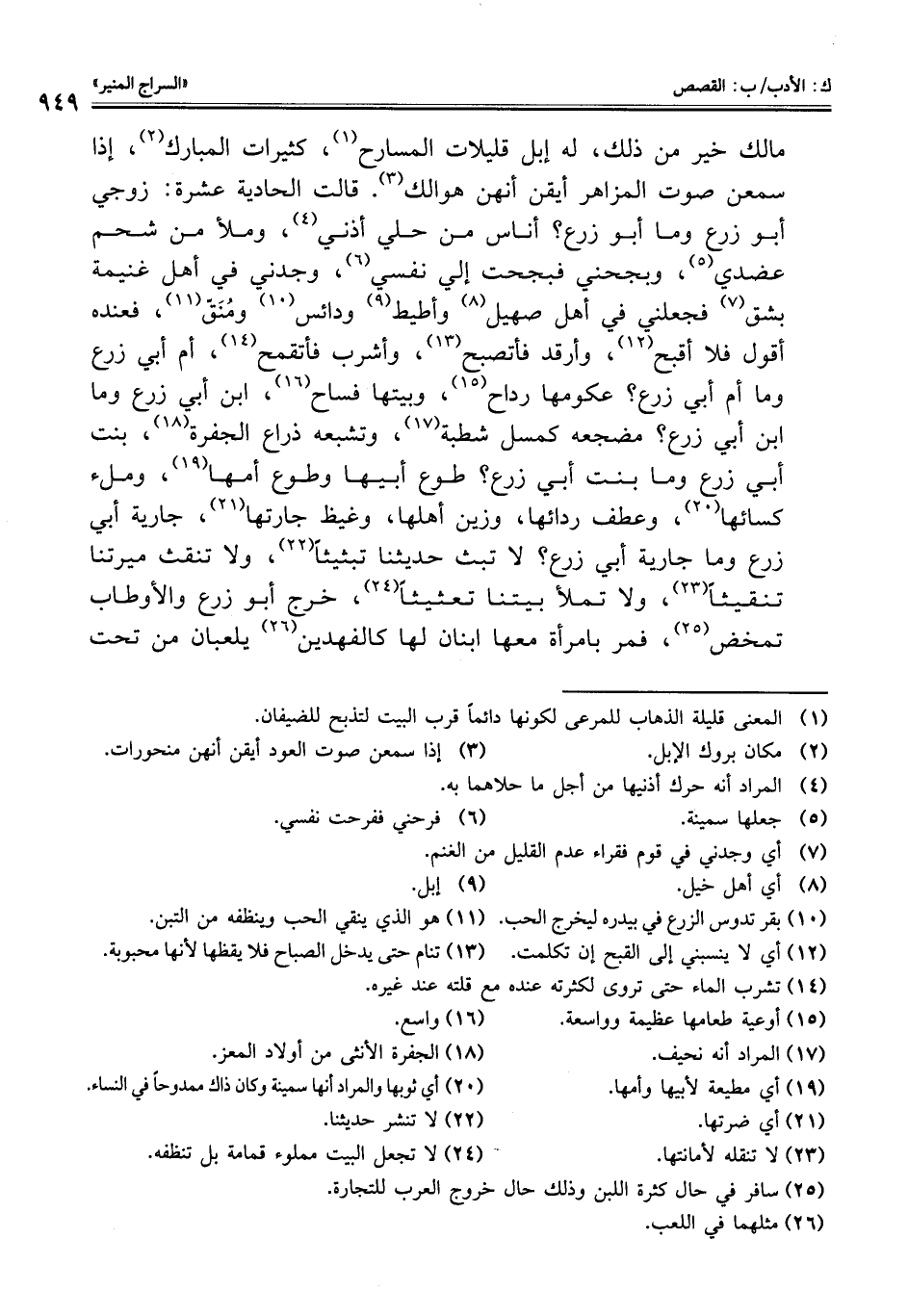 مالك خير من ذلك، له إبل قليلات المسارح (¬1)، كثيرات المبارك (¬2)، إذا سمعن صوت المزاهر أيقن أنهن هوالك (¬3). قالت الحادية عشرة: زوجي أبو زرع وما أبو زرع؟ أناس من حلي أذني (¬4)، وملأ من شحم عضدي (¬5)، وبجحني فبجحت إلي نفسي (¬6)، وجدني في أهل غنيمة بشق (¬7) فجعلني في أهل صهيل (¬8) وأطيط (¬9) ودائس (¬10) ومُنَقّ (¬11)، فعنده أقول فلا أقبح (¬12)، وأرقد فأتصبح (¬13)، وأشرب فأتقمح (¬14)، أم أبي زرع وما أم أبي زرع؟ عكومها رداح (¬15)، وبيتها فساح (¬16)، ابن أبي زرع وما ابن أبي زرع؟ مضجعه كمسل شطبة (¬17)، وتشبعه ذراع الجفرة (¬18)، بنت أبي زرع وما بنت أبي زرع؟ طوع أبيها وطوع أمها (¬19)، وملء كسائها (¬20)، وعطف ردائها، وزين أهلها، وغيظ جارتها (¬21)، جارية أبي زرع وما جارية أبي زرع؟ لا تبث حديثنا تبثيثًا (¬22)، ولا تنقث ميرتنا تنقيثًا (¬23)، ولا تملأ بيتنا تعثيثًا (¬24)، خرج أبو زرع والأوطاب تمخض (¬25)، فمر بامرأة معها ابنان لها كالفهدين (¬26) يلعبان من تحت