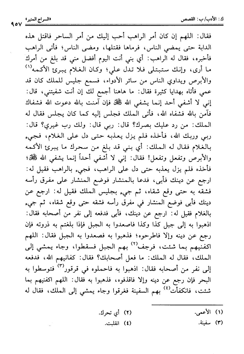 فقال: اللهم إن كان أمر الراهب أحب إليك من أمر الساحر فاقتل هذه الدابة حتى يمضي الناس، فرماها فقتلها، ومضى الناس؛ فأتى الراهب فأخبره، فقال له الراهب: أي بني أنت اليوم أفضل مني قد بلغ من أمرك ما أرى، وإنك ستبتلى فلا تدل علي؛ وكان الغلام يبرئ الأكمه (¬1) والأبرص ويداوي الناس من سائر الأدواء، فسمع جليس للملك كان قد عمي فأتاه بهدايا كثيرة فقال: ما هاهنا أجمع لك إن أنت شفيتني، قال: إني لا أشفي أحد إنما يشفي اللَّه عز وجل فإن آمنت باللَّه دعوت اللَّه فشفاك فآمن باللَّه فشفاه اللَّه، فأتى الملك فجلس إليه كما كان يجلس فقال له الملك: من رد عليك بصرك؟ قال: ربي قال: ولك رب غيري؟ قال: ربي وربك اللَّه، فأخذه فلم يزل يعذبه حتى دل على الغلام، فجيء بالغلام فقال له الملك: أي بني قد بلغ من سحرك ما يبرئ الأكمه والأبرص وتفعل وتفعل! فقال: إني لا أشفي أحدًا إنما يشفي اللَّه عز وجل؛ فأخذه فلم يزل يعذبه حتى دل على الراهب، فجيء بالراهب فقيل له: ارجع عن دينك فأبى، فدعا بالمنشار فوضع المنشار على مفرق رأسه فشقه به حتى وقع شقاه، ثم جيء بجليس الملك فقيل له: ارجع عن دينك فأبى فوضع المنشار في مفرق رأسه فشقه حتى وقع شقاه، ثم جيء بالغلام فقيل له: ارجع عن دينك، فأبى فدفعه إلى نفر من أصحابه فقال: اذهبوا به إلى جبل كذا وكذا فاصعدوا به الجبل فإذا بلغتم به ذروته فإن رجع عن دينه وإلا فاطرحوه؛ فذهبوا به فصعدوا به الجبل فقال: اللهم اكفنيهم بما شئت، فرجف (¬2) بهم الجبل فسقطوا، وجاء يمشي إلى الملك، فقال له الملك: ما فعل أصحابك؟ فقال: كفانيهم اللَّه، فدفعه إلى نفر من أصحابه فقال: اذهبوا به فاحملوه في قرقور (¬3) فتوسطوا به البحر فإن رجع عن دينه وإلا فاقذفوه، فذهبوا به فقال: اللهم اكفنيهم بما شئت، فانكفأت (¬4) بهم السفينة فغرقوا وجاء يمشي إلى الملك، فقال له