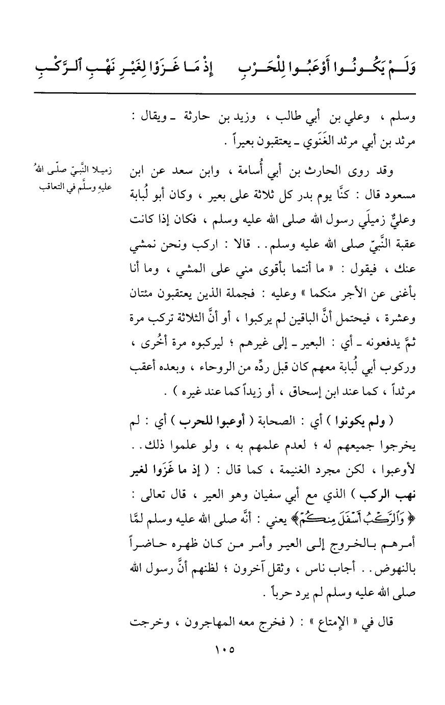 وقد روى الحارث بن أبي أسامة، وابن سعد عن ابن مسعود قال: كنّا يوم بدر كل ثلاثة على بعير، وكان أبو لبابة وعليّ زميلي رسول الله صلى الله عليه وسلم، فكان إذا كانت عقبة النّبيّ صلى الله عليه وسلم.. قالا: اركب ونحن نمشي عنك، فيقول: «ما أنتما بأقوى مني على المشي، وما أنا بأغنى عن الأجر منكما» وعليه: فجملة الذين يعتقبون مئتان وعشرة، فيحتمل أنّ الباقين لم يركبوا، أو أنّ الثلاثة تركب مرة ثمّ يدفعونه- أي: البعير- إلى غيرهم؛ ليركبوه مرة أخرى، وركوب أبي لبابة معهم كان قبل ردّه من الروحاء، وبعده أعقب مرثدا، كما عند ابن إسحاق، أو زيدا كما عند غيره) .