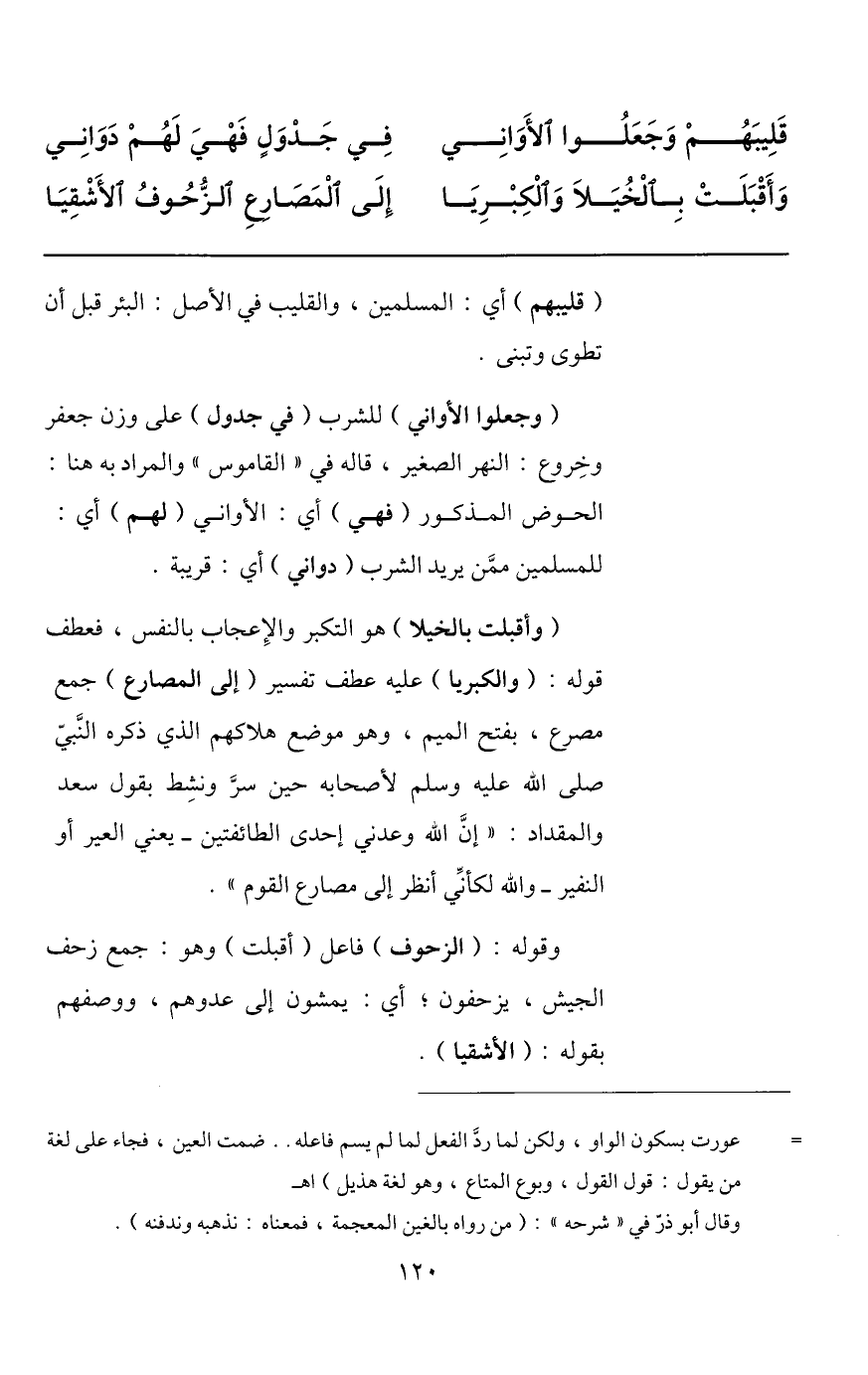 (وأقبلت بالخيلا) هو التكبر والإعجاب بالنفس، فعطف قوله: (والكبريا) عليه عطف تفسير (إلى المصارع) جمع مصرع، بفتح الميم، وهو موضع هلاكهم الذي ذكره النّبيّ صلى الله عليه وسلم لأصحابه حين سرّ ونشط بقول سعد والمقداد: «إنّ الله وعدني إحدى الطائفتين- يعني العير أو النفير- والله لكأنّي أنظر إلى مصارع القوم» .