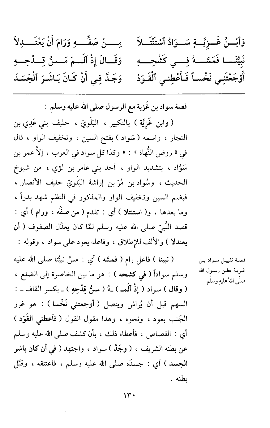 (وابن غزيّة) بالتكبير، البلويّ، حليف بني عدي بن النجار، واسمه (سواد) بفتح السين، وتخفيف الواو، قال في «روض النّهاة» : «وكذا كل سواد في العرب، إلّا عمر بن سوّاد، بتشديد الواو، أحد بني عامر بن لؤي، من شيوخ الحديث، وسواد بن مرّ بن إراشة البلويّ حليف الأنصار، فبضم السين وتخفيف الواو والمذكور في النظم شهد بدرا، وما بعدها، و (استنتلا) أي: تقدم (من صفّه، ورام) أي: