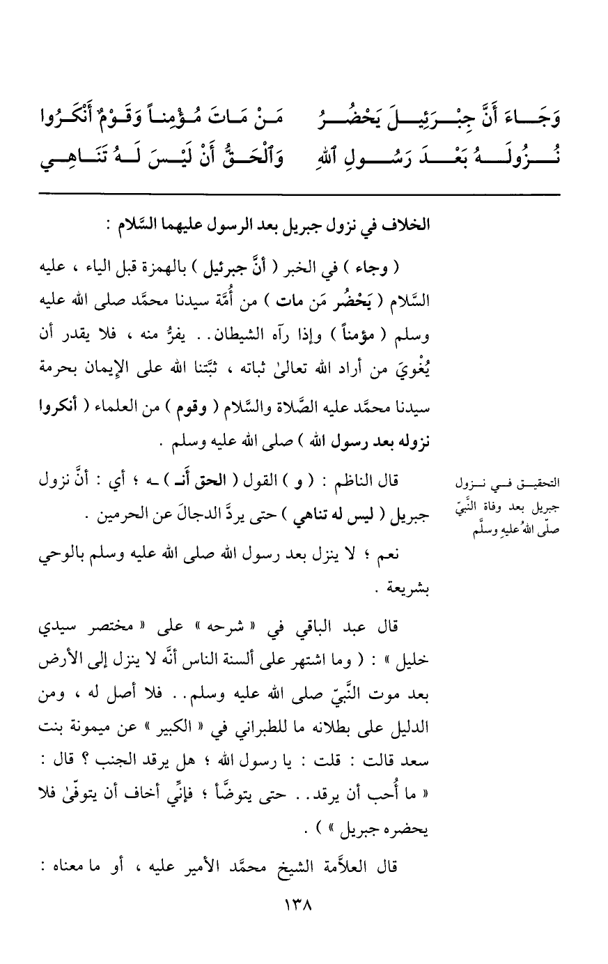 (وجاء) في الخبر (أنّ جبرئيل) بالهمزة قبل الياء، عليه السّلام (يحضر من مات) من أمّة سيدنا محمّد صلى الله عليه وسلم (مؤمنا) وإذا رآه الشيطان.. يفرّ منه، فلا يقدر أن يغوي من أراد الله تعالى ثباته، ثبّتنا الله على الإيمان بحرمة سيدنا محمّد عليه الصّلاة والسّلام (وقوم) من العلماء (أنكروا نزوله بعد رسول الله) صلى الله عليه وسلم.